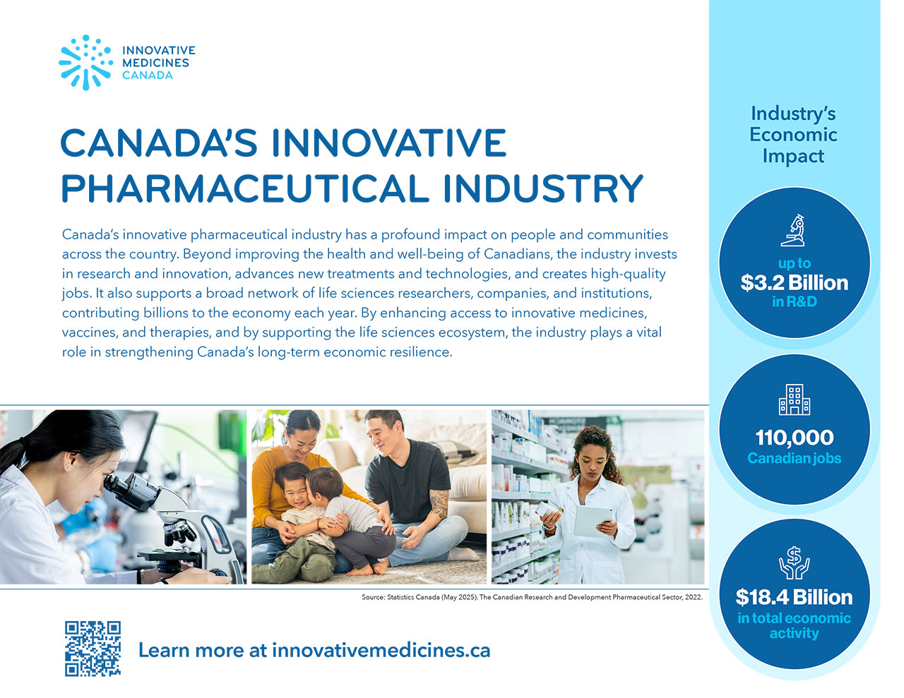 Canada’s innovative pharmaceutical industry contributes nearly $18.4 billion to the economy each year. It supports more than 110,000 jobs, funds thousands of clinical trials, and invests $3.2 billion annually in research and development, driving health innovation and economic growth right here in Canada.
